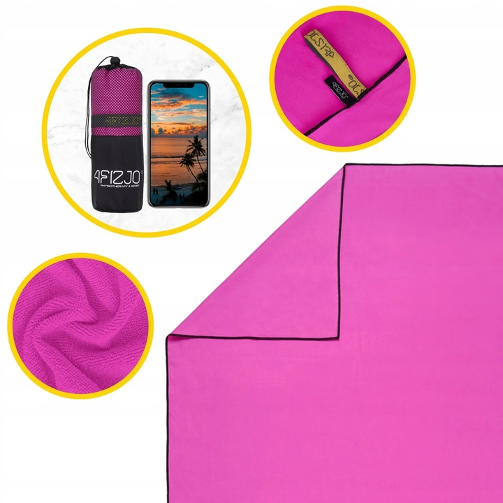 Po zwinięciu ręcznika i schowaniu go do pokrowca jest niewiele większy od smartfona. Zmieści się nawet w kieszeni. W jego zwinięciu pomaga doszyta elastyczna gumka z logo 4Fizjo. Przy tym wszystkim, ręcznik ma optymalny wymiar dla każdego, możesz się w niego wytrzeć po basenie albo rozłożyć na macie podczas pilatesu czy jogi, bez problemu zmieścisz go w plecaku podczas wycieczek. Jest bardzo lekki, zajmuje mało miejsca i szybko schnie. Ręcznik posiada uchwyt do powieszenia na haczyku. Do ręcznika otrzymujesz pokrowiec z przewiewnej siateczki.